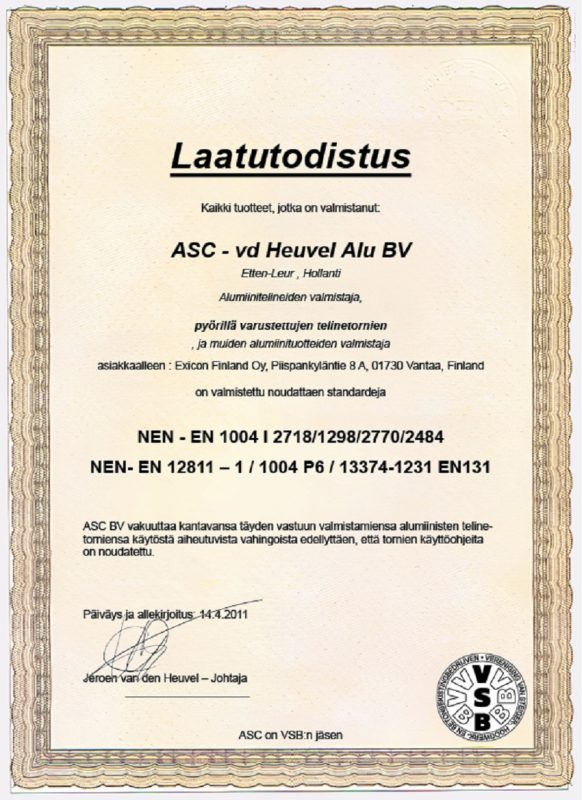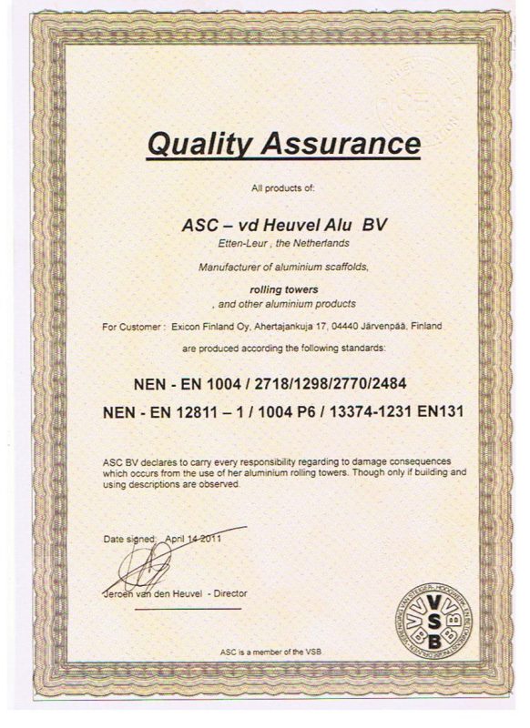 Kaikki tuotteemme ovat Suomessa hyväksyttyjä ja valmistetaan NEN EN 1004 ja NEN EN 12811-1 standardien mukaisesti. Ne täyttävät kaikki Suomen säännökset ja määräykset.